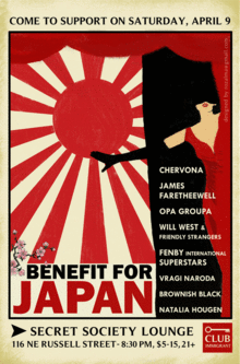 list of performers: Chervona Opa Groupa Fenby International Superstars Vragi Naroda Natasha Haugen Will West James Fareethewell (with band) Russian Folk Dance group "Matryoshki" Brownish Black Belly dancers DJ Ded Moroz wine, more music, raffle prizes, more music, chocolate, more music, full bar, more music, more prizes-all for Japan.