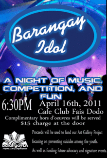 Barangay Idol is an annual fund-raising singing competition targeting up-and-coming artists and performers in the Filipino community. Barangay Idol provides an evening of entertainment in a safe and inclusive space to highlight the brightest vocalist in the Los Angeles area.