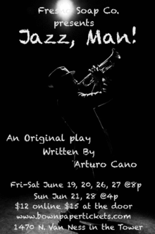 Jazz, Man! A one act play written by Arturo Cano, Directed by R.S. Scott, Produced by Fresno Soap Co. Starring Mathew Vargas, Charlene Cano, Kodie Egenolf, Jason Andrew, Christopher Cook, Raphique Barakat and Jacquelin Allen.