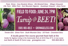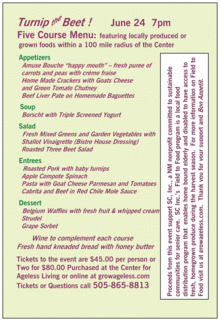 "Turnip the Beet" is this year's theme for the 4th annual Field to Food Event. SC, Inc. a NM nonprofit committed to sustainable communities for senior care sponsors the Field to Food program which distributes fresh produce, in season, to home bound elders. The five course gourmet meal with wine is set under the stars in the Community Park at the Center for Ageless Living. All the ingredients for the meal are from local food producers from within 100 mile radius of the Center. This year's proceeds from this event are helping to develop a certified organic garden that will provide the produce for the Field to Food distribution program.