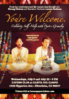 Omniscient and sensual Soul Guides Grimsley and Pytor return to the Cavern Club at Casita Del Campo for two exceptionally enlightening SHOW-MINARS(tm) in which audience members and celebrity guests will find their spirits, their belief systems and their very fragrance unmasqued and explicated and disseminated and other long and important words. No fear will be left unscraped; no shirt-stain unremarked on. Please bring a few offerings from your moon bowl, your favorite abundance votive and singles for tipping. NO PETS THIS TIME.