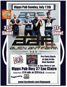 The one and only Alien Ant Farm rocks Hipps Pub on Sunday, July 12th with Special Guests: Run 2 Cover and KingShifter! Alien Ant Farm is know for their Smash Hit Remake of "Smooth Criminal"! Alien Ant Farm is a Grammy Nominated Band with much radio success! This is an indoor concert and is a 21+ show! Tickets are only $14 adv or $20 d.o.s. Doors open at 6pm, music at 7pm. Call (715) 834-7822for more info!