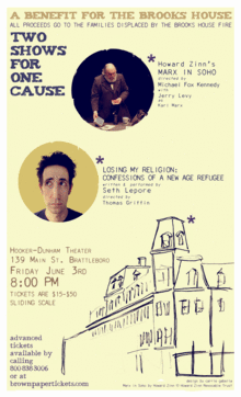 Two Shows for One Cause. Marx in Soho and Losing My Religion: Confessions of a New Age Refugee. All proceeds go to the families displaced by the Brooks House Fire.