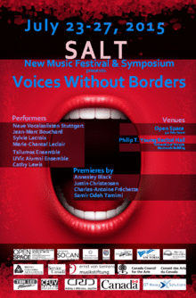 The 2015 SALT New Music Festival and Symposium will present four concerts at Open Space, downtown Victoria, and one at the PTY recital hall at UVic; bringing world-renowned Canadian and international composers and performers to the west coast of British Columbia. This year's events will focus around the voice and provide an opportunity to hear a variety of new and recently composed work for voice and vocal ensemble.