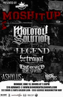 Molotov Solution, Legend, Betrayal, The World We Knew, Ashylus & Mortal Remains play Rays Golden Lion for an all ages show as the Mosh It Up Tour comes to Richland, WA