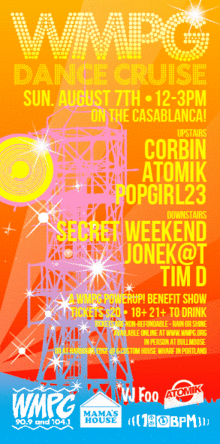 WMPG's second annual Beats on the Bay Dance Cruise, held in partnership with Casablanca Cruises, and features TWO floors of music this year! Upstairs: DJ CORBIN; ATOMIK; POPGIRL23 Downstairs: Secret Weekend; Jonek@t; TimD Light Hors D'Oeuvres. Cash Bar. All ages.