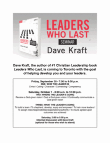 Dave Kraft, the author of #1 Christian Leadership book Leaders Who Last, is coming to Toronto with the goal of helping develop you and your leaders.