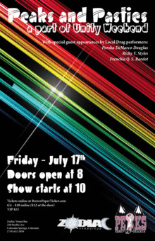 Join Peaks and Pasties as we celebrate individuals and couples of all kinds! We will show you our diversity, self love, new love, some wild things! We are also honored to have a few local drag performers as special guests! Ricky V. Styles Porsha DeMarco-Douglas Frenchie Q. S. Bardot