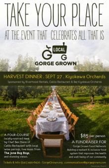 This event is sponsored by Riverhood Rentals, Celilo Restaurant and Bar, Kiyokawa Family Orchards, Cor Cellars, pFriem Family Brewers, and Gorge Grown Food Network.
