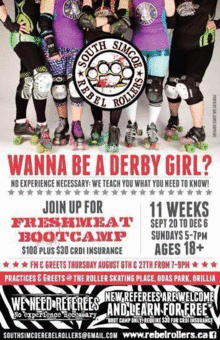 |  | EventSouth Simcoe Rebel Rollers Fresh Meat Fall BootcampSunday, September 20 to December 6 (no bootcamp Thanksgiving Sunday Oct 11). This is where you learn how to skate - and the other skills required to play roller derby.