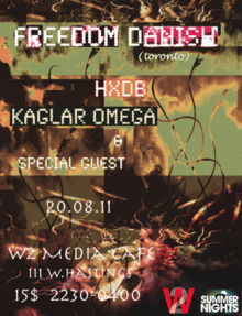 ...The name Freedom Danish is a satirical attempt to break through the political rhetoric of historical food propaganda through music & dance. "The name is 'an ultimate f-you to anybody that wants to use food propaganda to control people's minds,' explains Jorah Kai, the man behind the red, white and blue pastry. The DJ has also written a book of poetry, inspired by food and time spent pretending to work backshift at a grocery store, spending long nights staring at tanks of lobsters. 'Lobsters are a lot like people,' he explains. 'Most of them are crazy and most of them are trapped.'" Lizzy Hill, The Coast (Halifax, NS Canada) Sept 3, 2009.