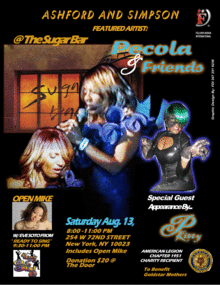 Pecola and a host of Singers will share various vocal talents at the quiant Ashhford & Simpson's Sugar Bar in Manhattan New York. Eve Soto, Vocal Coach of 'Ready To Sing' will ignite the evening with an open mike' segment to the show for upcoming singers and folks who wanna share their 'song' with the rest of us.This event is target for American Legion Post#1951 (Gold Star Mothers)- Recipient(s) who's children/spouses died as a result of war in defense of the United States of America.