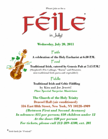 Join us for an evening of FAITH (Holy Eucharist) at 6:30 P.M.; followed by FOOD (traditional Irish fare - Shepherd's Pie; Cabbage, potatoes, and Bacon; Not-so-traditional Irish fare: Pasta Primavera!); and FIDDLING by award-winners Kira and Joe Jewett! All are welcome! Beer, wine, and soda will be sold.