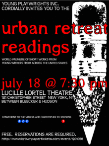 The Young Playwrights Inc. 2015 Urban Retreat Readings is a one-night-only professional presentation of new plays by Emory Richmond Boll, Ariella Carmell, Sasha Manus, Helen Everbach, Jeremy Goldstein, Milo Hume, Izzy Michels, Stephanie Okun, and Graham Rogers.