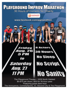 In effect, the marathon is 30 unique shows, as each hour the marathoners welcome guests from around the city to improvise with them, including performers from the Second City, iO, ComedySportz, the Annoyance Theatre, and K.C. Redheart's home, the Playground. With the help of so many different performers, the Playground Improv Marathon will showcase the diversity and vitality of Chicago's improv scene. There will be short-form games in the style of Whose Line Is It Anyway?, experimental and narrative long-form shows, family-friendly shows during the day, and anything-goes sets during the late night hours. As an added bonus, the audience will witness the Marathoners' transformation from well-adjusted adults to sleep-deprived comedy nutjobs by the end of it all. And most importantly, all of the proceeds go to charity.