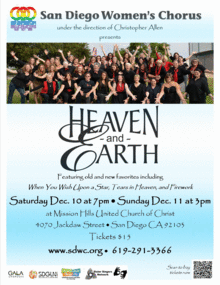 The San Diego Women's Chorus, under the direction of Christopher Allen, presents two conerts of Heaven & Earth" - Saturday, December 10 at 7:00pm and Sunday, December 11 at 3:00pm. Join SDWC for this family-friendly concert full of reflective, inspiring and fun songs for your holiday season.