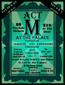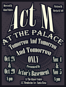 An adaptation of William Shakespeare's Macbeth, Act M: At The Palace Tomorrow and Tomorrow and Tomorrow Only puts a vaudeville spin on everything we know of the classic tragedy. Beware of ghosts, patent medicine, kilts, and a singing duck. Just like the great vaudeville shows of days past, Act M: At The Palace Tomorrow and Tomorrow and Tomorrow Only has a little bit of everything: a comedy team with deadly ambition, a Shakespearean actor with a drinking problem and a psychic with an "aboriginal spirit guide." How does all this add up to Macbeth? You'd have to see it to believe it!