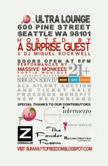 Lauryn Grinnell presents The 2nd Annual "Runway to Freedom" Charity Fashion Show. 100% of proceeds benefit NW non-profit, New Beginnings, a domestic violence support group. Special guest Host TBA with performances by Portia Monique, Jairemie Alexander, and Massive Monkeys.