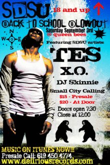 Join us for the Back to School Blowout! Starring some of SDSU Stars! X.O. - Small City Calling - and Headlining TES D.J. Skinny will be on the ones and twos!