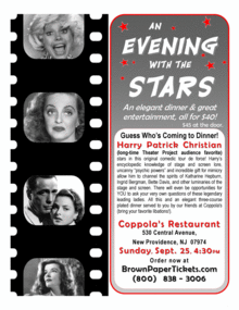 New Jersey's Theater Project presents "An Evening with the Stars" - An elegant dinner with great entertainment. Guess Who's Coming to Dinner! Harry Patrick Christian (long-time Theater Project audience favorite) stars in this original comedic tour de force! Harry's encyclopedic knowledge of stage and screen lore, unacanny "psychic powers" and incredible give for mimicry allo him to channel the spirits of Katharine Hepburn, Ingrid Bergman, Bette Davis, and other luminaries of the stage and screen. There will even be opportunities for YOU to ask your very own questions of these legendary leading ladies. All this and an elegant three-course plated dinner served to you by our friends at Coppola's (bring your favorite libations!).
