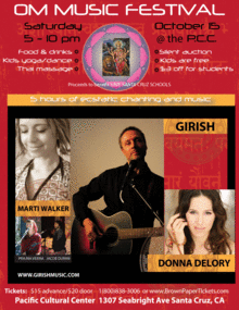 MC Bhavananda Set design by Annapurna Pacific Cultural Center 1307 Seabright Ave Santa Cruz, CA 95062 www.ommusicfestival.com, www.girishmusic.com Tickets are $15 in advance at www.brownpapertickets.com and 24/7 Ticket Hotline: 1-800-838-3006 $20 at the door Kids are free, $3 student discount at the door with ID