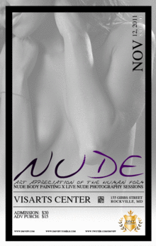 Where: 155 Gibbs Street, Rockville, MD (301) 315-8200 Date: November 12, 2011 Time: 8:00pm11:30pm DMV Nude. The beauty of the female form. A tasteful live erotic photography session featuring a live Nude Model. The gallery will display the exotic work of local photographers and their take on the body as an art form. Live Photography Session conducted.