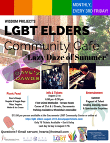 June's LGBT Elders Community Café is an affordable $15 and will be at the First United Methodist at 2100 J Street, Sacramento, CA 95816 from 6-8:30 p.m.