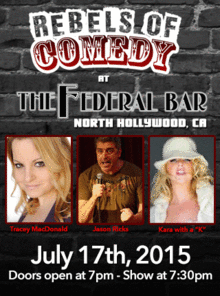 It's Rebels of Comedy at the Federal Bar in North Hollywood. Come out and see a night of live comedy, featuring an awesome lineup of professional features and headliner comedians. Hosted By Tracey MacDonald, with Headliners : Jason Ricks Kara with a "K"