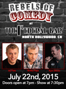 It's Rebels of Comedy at the Federal Bar in North Hollywood. Come out and see a night of live comedy, featuring an awesome lineup of professional features and headliner comedians. Hosted By Jay Flats, with Headliners Bobby Pope, Ryan Shores