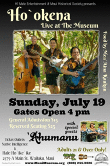 Ho'okena at the Museum will feature live traditional Hawaiian music, fresh island cuisine, locally made beer and a selection of wines. Ho'okena is an award-winning island band and is popular for their traditional Hawaiian Mele (songs). Opening for the evening will be 'Ahumanu, a popular Maui female group.