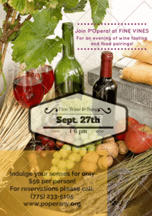 P'Opera! Invites you to Fine Vines. Come and enjoy an elegant evening of wine tastings perfectly coupled with delicious food pairings. Four courses will be expertly offered in an intimate setting. As you unfold your senses with wine and food, you will be surrounded with arias and art songs filling your soul. Please make your reservations soon as seating is limited for this event (21 and over only).