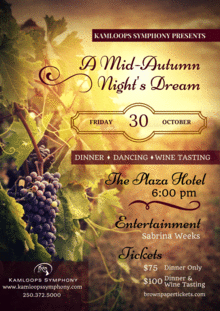 The Kamloops Symphony will be hosting their annual fundraising dinner. This year enjoy a three course menu boasting the amazing flavours of fall, the fabulous singing of Sabrina Weeks, interactive wine tasting and silent auction. 6:00 PM - Wine Tasting 7:00 PM - Cocktails 7:30 PM - Dinner 9:00 PM - Dancing with music by Sabrina Weeks