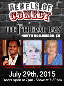 It's Rebels of Comedy at the Federal Bar in North Hollywood. Come out and see a night of live comedy, featuring an awesome lineup of professional features and headliner comedians. Hosted By Teddy Tutson, with Headliners Michelle Maxwell, Lisa-Gay Tremblay