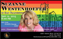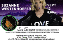 SUZANNE WESTENHOEFER in non-stop side-splitting comedy. Hilarity, with a touch of edgy truth, a dab of sexual innuendo, and you have the best of the best. Suzanne was the first openly gay comic on television. A treasure find for all who see her performance. Come early, because there are no intermissions for this performance In a new LGBTQ-friendly performance venue. AFFORDABLE & MEMORABLE NIGHT OUT: Dine at one of the many excellent local cafes, come to the concert, meet-up with friends & neighbors all within walking distance MEET & GREET: Stay after the performance for refreshments available for purchase BENEFITS: Jazz Sunday Services @ Park Presidio PARKING: Street parking adjacent to church and in the neighborhood (especially west & south of church); public paid lot on 8th Ave between Geary & Clement; paid lot @ Smart & Final parking lot on 7th between Geary & Clement ... PUBLIC TRANSPORTATION: Muni 38. ADVANCED - $25; RESERVED - (1st rows); DOOR - $35.