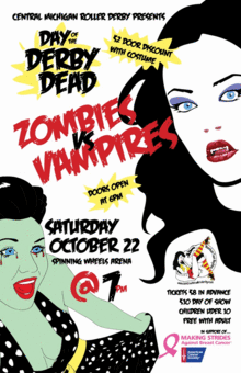 Come cheer on your favorite skater in the ultimate battle of the derby dead! Central Michigan Roller Derby will be hosting ZOMBIES and VMPIRES from Sault Roller Derby, Mitten Mavens, Chemical City Derby and Mid Michigan Derby!