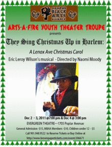 The Arts-A-F!RE Youth Theater Troupe jumpstarts the holiday season with a musical presentation of "They Sing Christmas Up In Harlem: A Lenox Ave. Christmas Carol." Written by playwright, director, scholar Eric Leroy Wilson, "They Sing Christmas Up in Harlem" is a timeless portrayal of how joy transforms a man, and a city. It is a new interpretation of Dickens's classic tale. Set in the late 1930s, the play revolves around a numbers-running, penny-pinching gangster by the name of Ebenezer "Scratch" Scrooge, who strikes terror into the heart of the Harlem community. But on a crisp Christmas Eve, it was Scrooge's turn to be frightened. Ancestral ghosts arrived, attempting to save Scrooge (and Harlem) from hate. Swinging through the past, present and future, this modern-day Christmas Carol is filled with the rhythms of jazz and voices of the Harlem Renaissance. Narrated by a bass player named Charlie, gospel-moaning ghosts, cutthroat gangsters, struggling citizens and poets come together to tell Dickens' timeless Christmas tale.