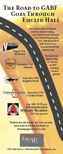 Join us for a series of intimate craft beer dinners leading up to the Great American Beer Festival featuring suds from some of our favorite craft breweries paired with creative food from Euclid's Chef Jake Grant. Verboten Brewing is the first dinner in a series of four every Thursday starting the last week of August. Dinner begins at 7:00 p.m. and the ticket price of $55.00 includes tax and gratuity.