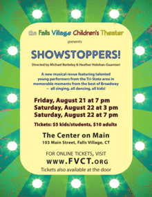 SHOWSTOPPERS! is a fun, fast-paced focus on the great scenes and songs from Broadway's best performed by our Tri-State area youth! Directed by Michael Berkeley and Heather Holohan-Guarnieri and performed at the Center on Main, the home of the Falls Village Children's Theater located at 103 Main Street, Falls Village, CT 06031.