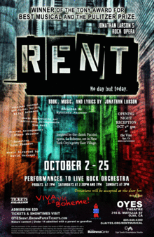 ---ABOUT THE SHOW Jonathan Larson's rock-opera, RENT, set in New York City's gritty East Village, RENT tells the unforgettable story of a group of young artists learning to survive, falling in love, finding their voices and living for today. "Measuring their lives in love," they strive for success and acceptance while enduring the obstacles of poverty, illness and the AIDS epidemic. RENT is Jonathan Larson's Pulitzer and Tony Award winning musical, and the seventh longest-running show in Broadway history.