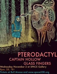 Jagged, yet precise, Pterodactyl's hyper-rhythmic noise-punk grind has drawn comparisons to a more scientific Lightning Bolt or a brighter Glenn Branca. But enough with comparisons - this New York band reaches for ecstatic, guitar-shredding heights and succeeds, big time. Catch them with the charged-indie rock of local guitar heroes Captain Hollow and the glitchy jams of Glass Fingers, the very promising project from South Portland's Jesse Gertz.