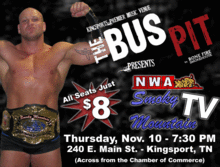 This event will be unlike any event in NWA Smoky Mountain history. The sound, set, lighting and production have all been upgraded... The Bus Pit's setting is the perfect atmosphere for the high flying, hard hittin' action of the National Wrestling Alliance!