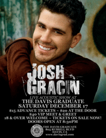 Josh Gracin, country music star and American Idol finalist, will be performing a live acoustic concert at The Davis Graduate on Saturday, December 17!