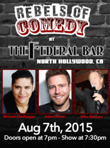 It's Rebels of Comedy at the Federal Bar in North Hollywood. Come out and see a night of live comedy, featuring an awesome lineup of professional features and headliner comedians. Featuring Michael Cienfuegos, with Headliners Adam Yenser, Mike Brennan