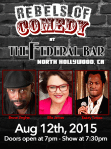It's Rebels of Comedy at the Federal Bar in North Hollywood. Come out and see a night of live comedy, featuring an awesome lineup of professional features and headliner comedians. Featuring Bruce Jingles, with Headliners Ella James, Teddy Tutson