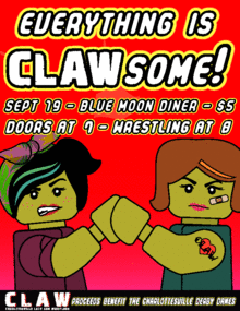 So BRING CASH and come on down to Blue Moon Diner to bet and bribe with CLAWbucks and participate in this one-of-a-kind spectacle during which 8 Ladies will arm wrestle for the Everything is CLAWsome title!