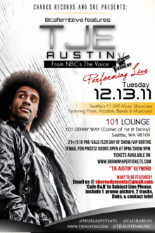 101 LOUNGE 101 DENNY WAY/Corner of 1st & Denny Seattle, WA 98109 21+/$20 ADV /VIP Booths (Email for Prices)Doors 8pm/Show 9pm Tickets Available on www.BROWNPAPERTICKETS.com "TJE AUSTIN" Keyword