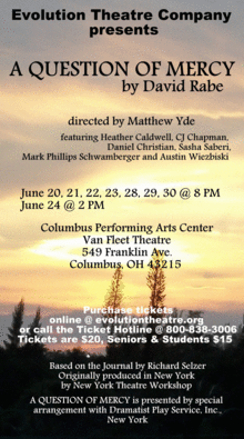 A Question of Mercy by David Rabe based upon the Journal by Richard Selzer. ''Sometimes it's easy to find answers to the hard questions. This play asks the hard, hard questions and there are no easy answers.'' A Question of Mercy probes the sensitive and controversial issue of doctor-assisted suicide.