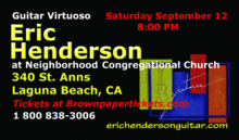 Over the last 20 years, Henderson has performed 17 tours across Europe and the United States. As one of only three people to study privately with the master guitarist Andres Segovia, Eric is considered to be one of the very best of currently performing classical guitar masters. Eric will perform traditional Spanish guitar works and some of his own innovative works. For more information on Eric please visit www.erichendersonguitar.com. TICKETS ARE AVAILABLE AT THE DOOR, STARTING AT 7:00.