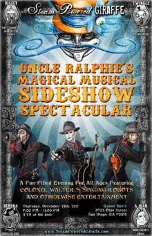 Though decades have passed since Uncle Ralphie last put on one of his events, he has returned from Kazooland with a colorful cavalcade of characters he calls, "Uncle Ralphie's Magical Musical Sideshow Spectacular." Joining to headline is Walter's own steam powered robots, supported by an arsenal of entertainers which include acrobats, belly dancers, contortionists, and more!