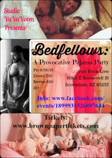 Studio VaVaVoom Presents Bedfellows~ A Provocative pajama party & burlesque revue Location: Pub Rock Live 8005 E Roosevelt St, Scottsdale, AZ 85257 Date: September 18 2015 Time: Doors open at 7:30PM for seating, Cabaret promptly at 8:30PM Info: https://www.facebook.com/events/1899931526897634/ Phone: (480) 945-4985 480-234-5271 Tickets: www.brownpapertickets.com Ticket Prices: $20